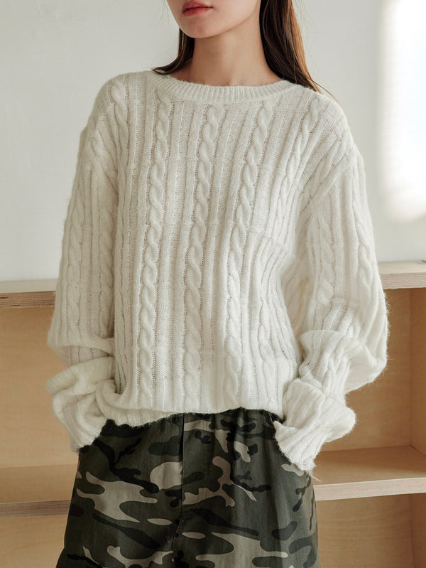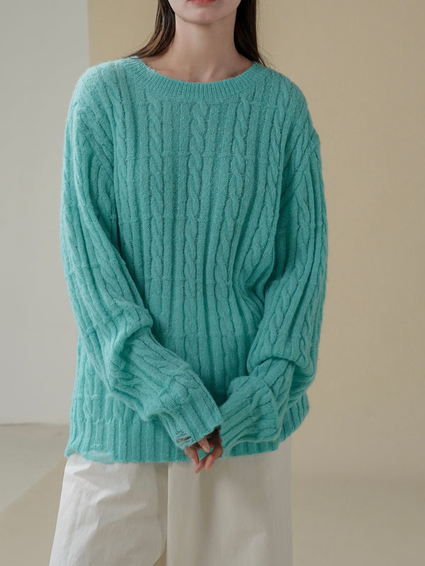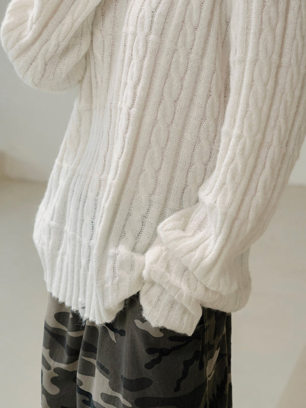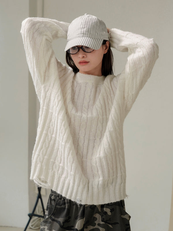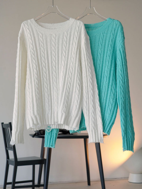 Stay chic with our Cable Knit Frayed Sweater. The delicate cable-knit design provides a gentle touch, while the loose fit allows for maximum comfort and breathability. The frayed hem adds a casual and relaxed style, perfect for layering over your favorite fitted tops. Elevate your wardrobe with this versatile and stylish sweater.